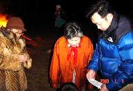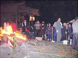 お参りのあと、たくさんの人々がたき火の周りに集まり、新年のあいさつを交わしたりして、談笑しています(左写真)。かっぽ酒もあるようですね。私は、話しかけてくれた近所の20年ぶりの里帰り青年、10年ぶり再会の元気な事業者・・・、1時間、2時間と話に花が咲きました。たくさんのふれあいがありました。いいですね。来年も楽しみにしています。午前12時過ぎです。町内外から参詣者がたえません。