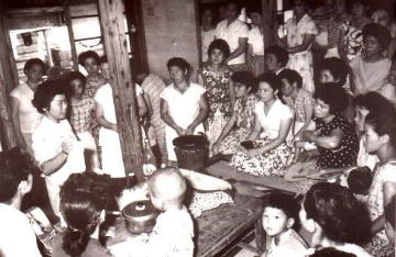 ![]() 炭住の集会所でよく開かれていた 料理講習会(昭和30年頃) |