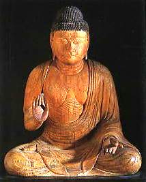 仏像は榧(かや)材で作られ、丈約84p、膝幅約66p、胸厚21pの一木造の坐像で、頭部には小さな螺髪(らはつ)をつけた肉髻(にくけい)をしています。また張りのある顔は、大きな眼と眉により強調され、静かな中にも力強い雰囲気がうかがえます。