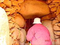 ここは下図の玄室に当たります。遺体が納めてあった部屋ですね。高さ2.5mほどで広さは3畳ほどもあるでしょうか。頭の向きはこちらだったのかなと想像しながら見回しますと、その石組みの凄さに圧倒されました。