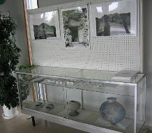 発掘された古墳の写真及び出土 した土器などの展示コーナー 棚の右に当発掘記録集が 置かれています。 |