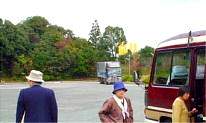 お寺のすぐ横に広大な駐車場が準備されています。写真の向こうにトヨタ九州工場の巨大な黄色い煙突が見えます。そこは、そうですね、ここからの距離は直線で1qほどでしょうか。 |