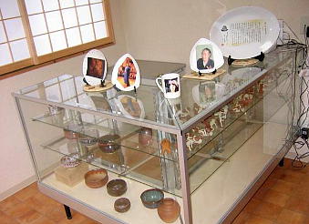 ![]() その陳列棚の部屋には、たくさんの作品等の 美術品等が展示されています。 向かって右から、吉田竜四郎さん、沢村さん、長東さんです。 |