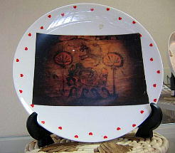 ここ独自の技法(これ秘密とのこと!)で 写真等を磁器に焼き付けた飾り皿やカップ! 写真をお持込みになれば、 本窯で記念の皿などをつくって頂けます。 |