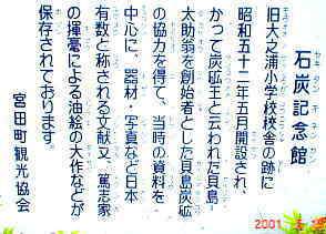 設 立 趣 旨 1世紀にわたる筑豊石炭産業を、最後まで支えた貝島炭鉱も、昭和51年(1976年)8月、ついに波乱多き90年の歴史を終えました。 旧宮田町の経済的支柱として果たした役割は大きいが、今やその功罪を問う声も低くはありません。 新しいエネルギーの開発や、無限の可能性をもつ旧宮田町民の復興への意欲は、まもなく石炭を、そして貝島という存在を過去の中に風化してしまうことでしょう。 今こそ貝島炭鉱とこれに関連あるいろいろな記録を残しておくことは、現代に生きる者の責務というべきではないでしょうか。 1、貝島炭鉱の創業から閉山まで 2、特筆すべき私学の記録 3、貝島を支えた労働者の記録 これが当石炭記念館の設立にあたっての柱であり、さらに旧宮田町内石炭の歴史追跡への拠点としての、役割を果たしてほしいと思います。 昭和52年5月 (当館のカタログより) |
