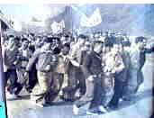炭坑には、昭和26年以降、押し寄せてくるエネルギー革命により、労働者の「闘い」の姿が見られるようになり、またそれに明け暮れた。 ここ宮田でも、本社(旧杉坂)前の広場を中心とした、デモ、スト決起集会などの怒濤の声で溢れていた。 しかし今では、その面影をみることはなく、ここ当館に静かに鎮魂の碑として飾って写真等を見るのみである。 |