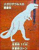 皆様ご存知ですか。 平成2年2月に、ここ千石峡で、全長約11m、体重約3トンの肉食恐竜「メガロザウルス」の約10pの歯の化石が発見されたことを。 左の図板が、近くに掲示してあります。このような恐竜がこの千石峡をノッシノッシと歩いていたのですね。1億3000万年前にですよ。宮若・宮田ってすごい?!ですね。。 |
