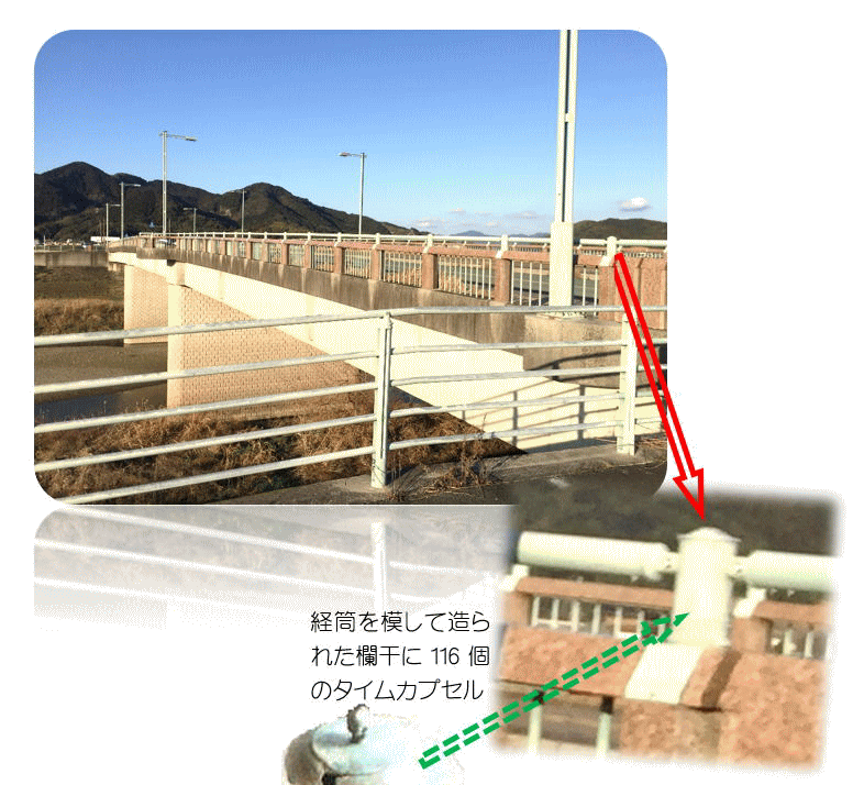 宮田緑大橋1998年に完成した際、旧宮田町平山辺りで出土された「経筒」を模した161個の欄干に、旧宮田町内の小中学校をはじめ数十団体・組織の皆さんの作品や作文を挿入し、30年後(2028年)に開筒して当時の思いに浸り、その後の良きまちづくりに資する目的でタイプカプセルのイベントが行われました。あと数年後の開筒が楽しみです。