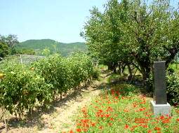 真光寺を後に来た道を少し戻ると、脇野小学校跡に同校の石碑(上写真)が立っていました。それは、松尾様宅近くの畑に赤い花に囲まれていました。
